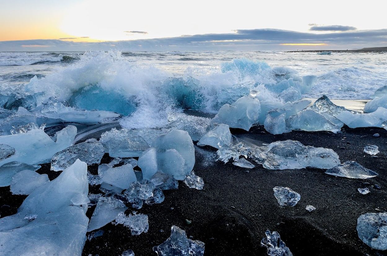 The first stop is Vestrahorn, a coastal mountain known for its black sand dunes and shallow tidal flats—an excellent spot for photos and a short walk. The tour continues to its main highlight: Jökulsárlón Glacier Lagoon, where large icebergs drift through a glacial lake toward the sea. Just across the road, visit Diamond Beach, where pieces of ice rest along the black shoreline, creating a striking natural contrast. On the return drive, stop at Eystrahorn, a rugged mountain with expansive views of the surrounding coastline.